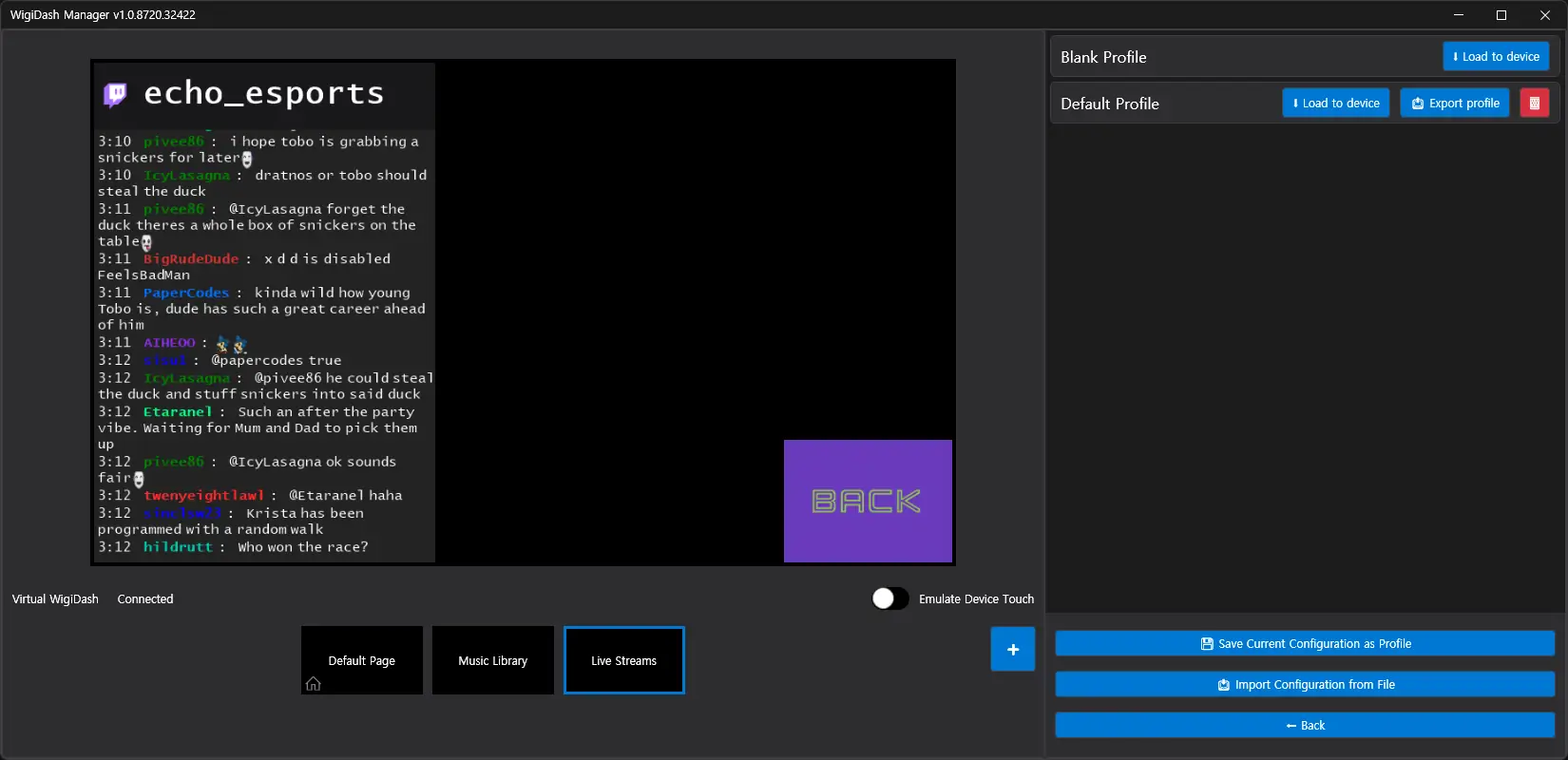 A 5×4 drag-drop widget canvas (20 programmable buttons) with profile import/export. The app bridges HWiNFO, AIDA64 SensorPanel, and a custom Twitch chat widget so users can monitor system health, streams, and hotkeys without Alt-Tabbing out of their game.